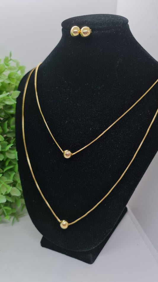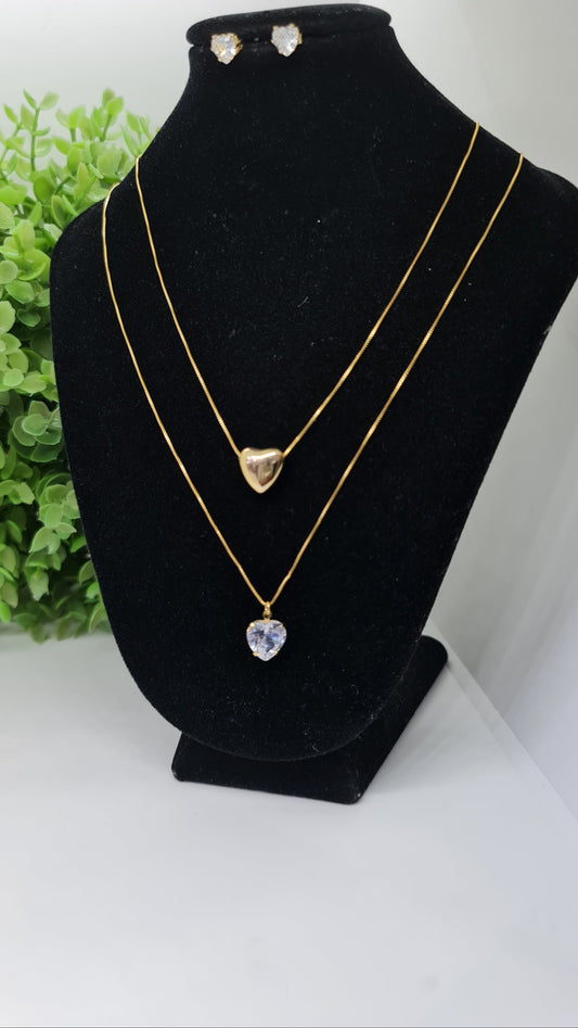 Set cadena doble con dije de corazon dorado y dije de corazon brillante + aros