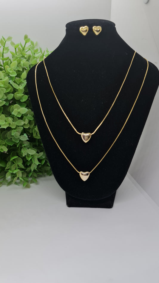 Set cadena doble con corazones macizos dorados + aros