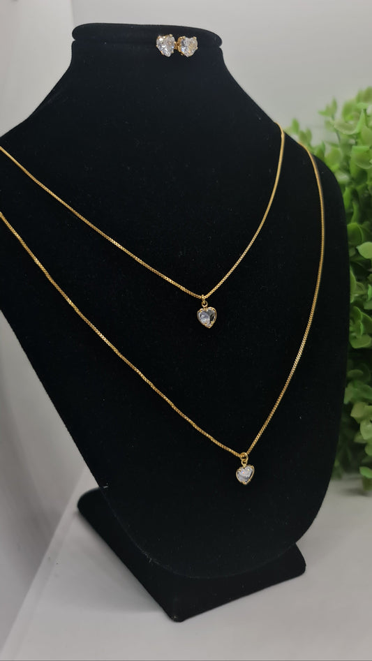 Set cadena doble con dije de corazon en circon + aros de corazon