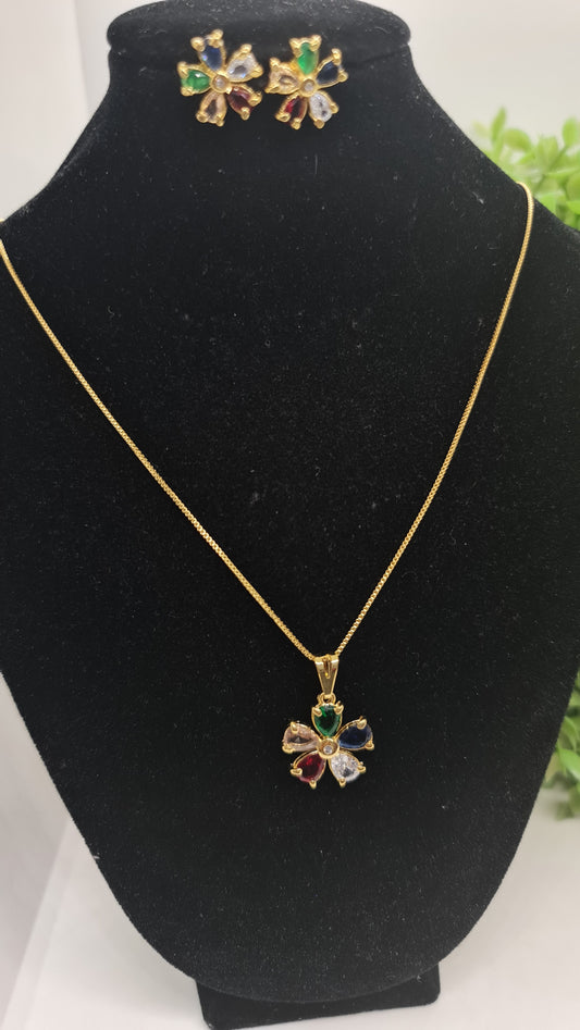 Set de cadena dorada con dije de flor multicolor + aros
